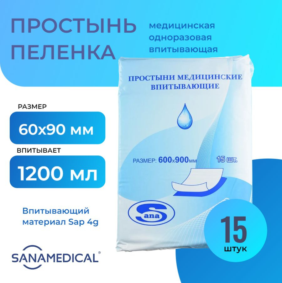 Простынь пеленка впитывающая Sana 60*90, 15 шт./уп.